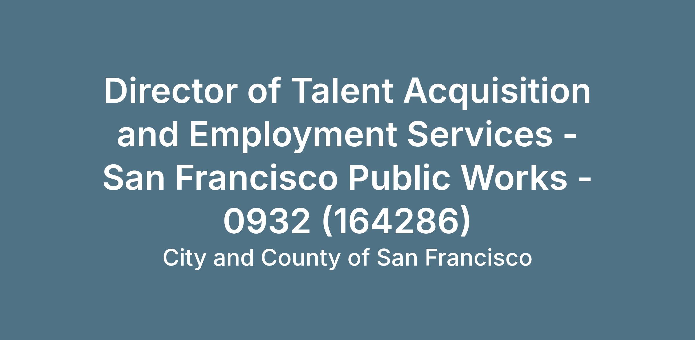 Under general administrative direction from the SFPW Human Resources Director, the Director of Talent Acquisition and Employment Services will develop strategies and work plans, supervise staff, research trends in relevant subject areas to inform and develop future plans, establish standard work, lead projects, and oversee cross-departmental collaboration to the success of different HR teams: Employment Services (HR Operations), Talent Acquisition (Exams)/Classification and Payroll. Â You will lead an innovative team of HR professionals by providing your expertise on special projects as assigned, many of which require your thoughtful management of sensitive communication with entities such as the City-wide Department of Human Resources, the Civil Service Commission, and other City departments, commissions, and boards on human resources-related matters, as well as compliance with staffing regulations. If you're excited to apply creative and modern approaches to develop solutions and projects to serve the needs of the many communities across San Francisco, you'll be interested in joining our Public Works HR team.Â