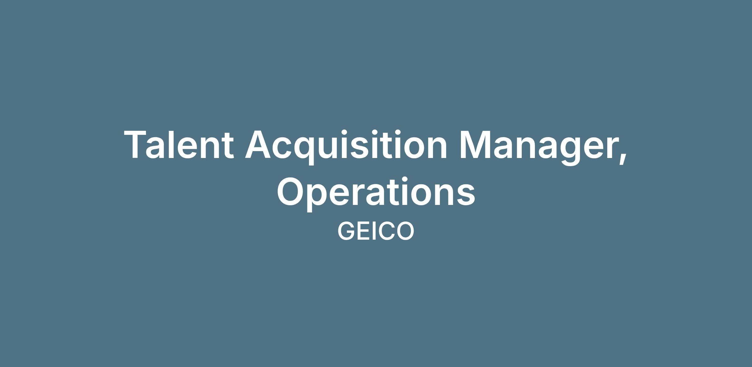 GEICO Talent Acquisition Department is seeking a driven, experienced, and entrepreneurial minded leader to join our team as the Manager of Talent Acquisition, Operations. This is a rewarding and challenging opportunity to lead a team of recruiters & talent acquisition specialists to meet our company recruiting goals. The manager will work closely with various business units to drive our recruiting strategy throughout the organization & will be committed to recruiting top talent in various positions for the company.