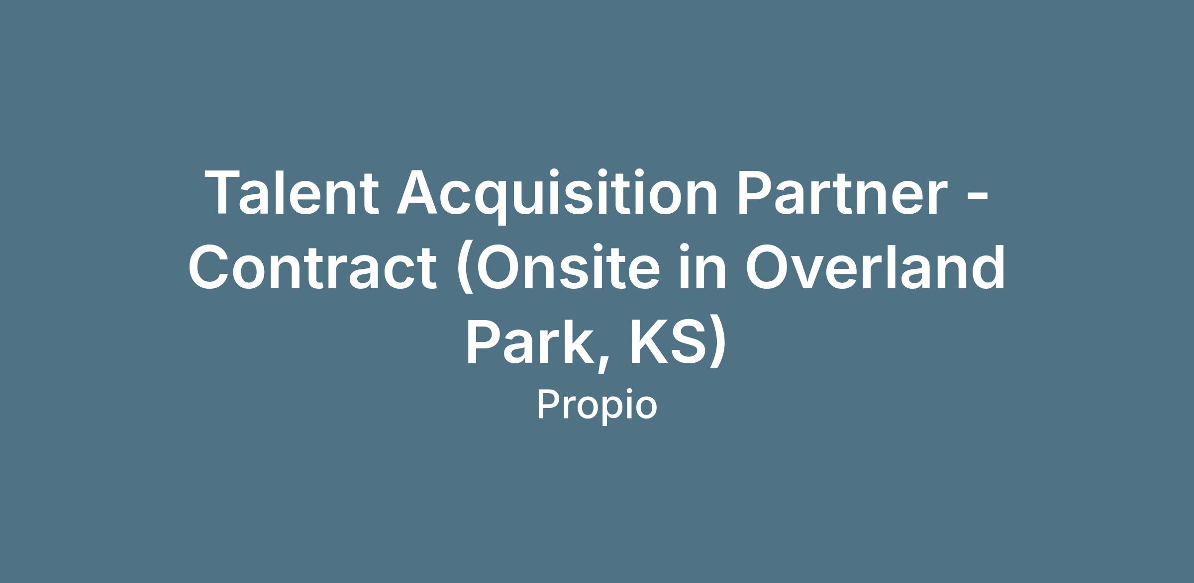 We are seeking a highly motivated and results-driven Talent Acquisition Partner (Contract) to join our team onsite in Overland Park, KS. The Recruiter/Talent Acquisition Partner will be responsible for sourcing, screening, and selecting candidates to fill open positions within our organization. The ideal candidate will have a passion for talent acquisition, excellent communication skills, and a proactive approach to recruiting.