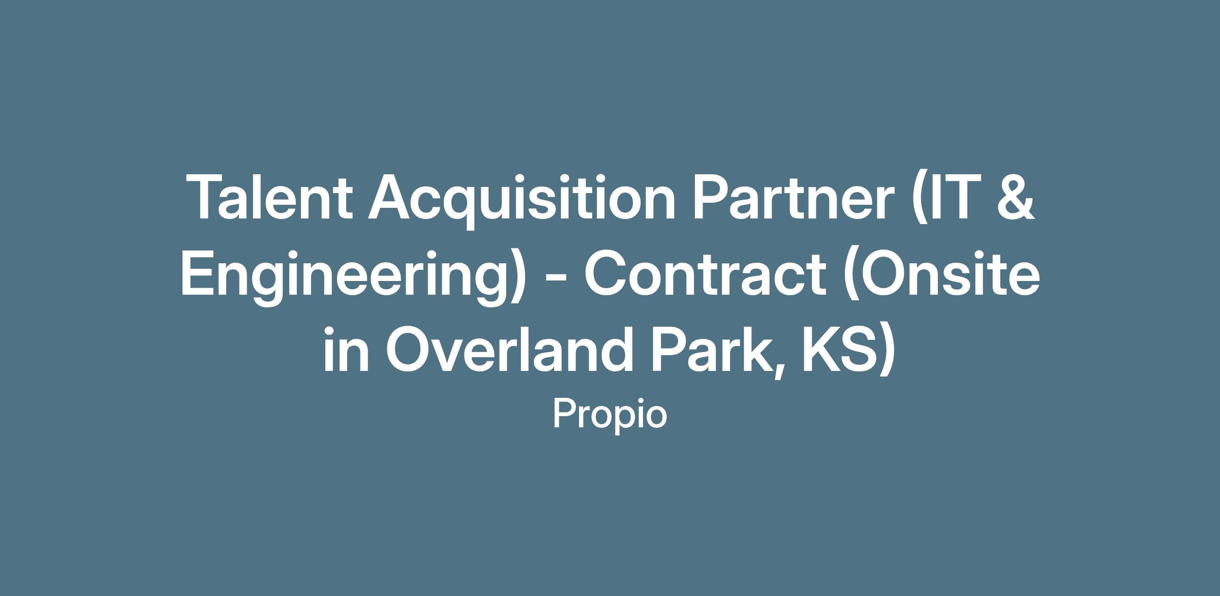 We are seeking a highly motivated and results-driven IT & Engineering-Focused Talent Acquisition Partner (Contract) to join our team onsite in Overland Park, KS. The Recruiter/Talent Acquisition Partner will be responsible for sourcing, screening, and selecting candidates to fill open positions within our organization. The ideal candidate will have a passion for talent acquisition, excellent communication skills, and a proactive approach to recruiting.